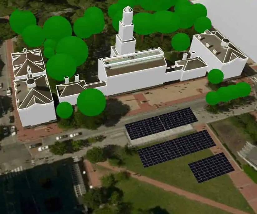 With a few manual adjustments and the addition of roof obstructions, we had a detailed 3D model from which to create an accurate solar design. Obstructions included two tall chimneys on the east and west wings of Independence Hall, the previously mentioned fences on the roof of the main building, and spires on the roofs of Congress Hall and Old City Hall. The area is also filled with many trees and a neighboring skyscraper that could cast shade on the roof, so we carefully modeled these structures as well.
